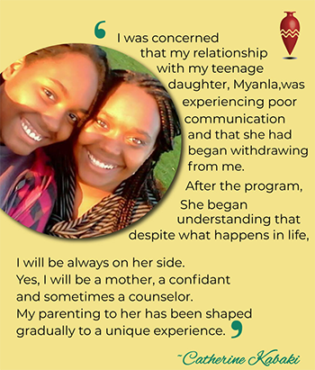 I was concerned that my relationship with my teenage daughter, Myanla Kabaki, was experiencing poor communication and that she had began withdrawing from me when she was sixteen. Her value systems had seemed to have changed since she was rejecting what I had instilled in her growing up.